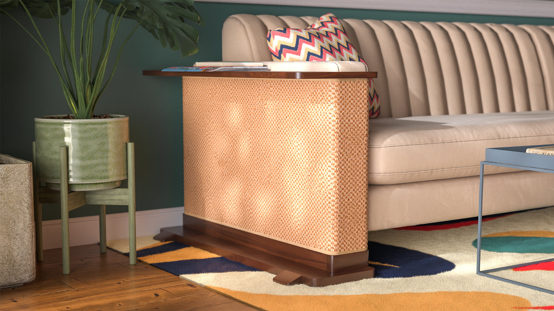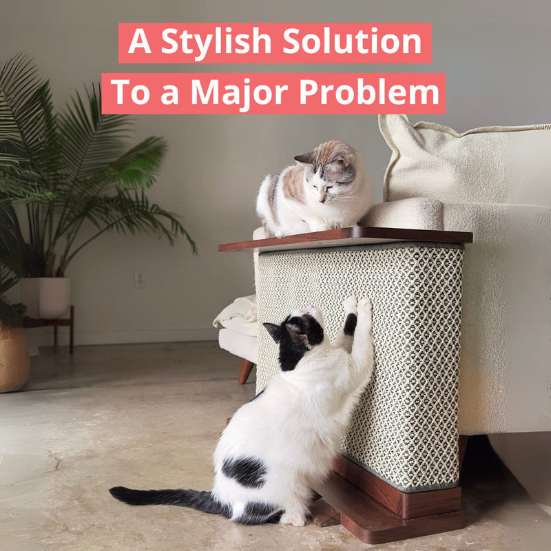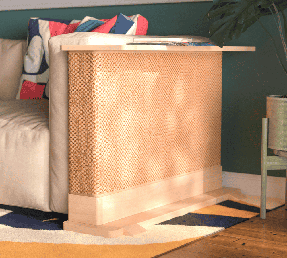 Elegantly solve a cat lovers conundrum with Cat-e-Corner, the patent-pending side table that simultaneously protects your sofa from scratches and entertains your cat.